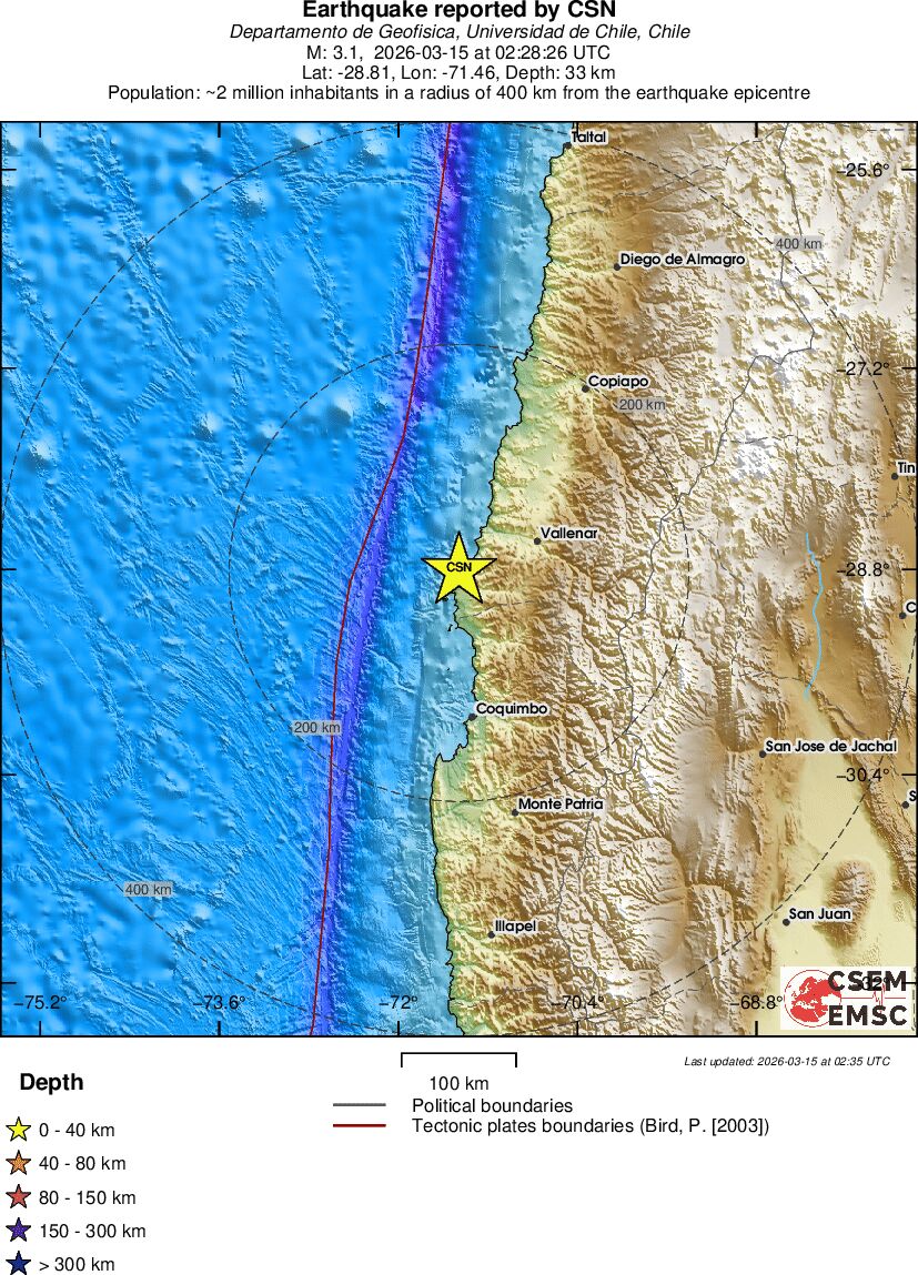 | 2.8 | 31.6 | 7533 | 19:31 | Poveznica | Manji potres - OFFSHORE ATACAMA, CHILE - Danas |